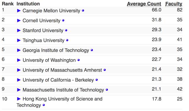 近日,麻省大学阿默斯特分校的 Emery Berger 教授公布了一个全球院校计算机科学实力排名的项目 csranking。该项目旨在了解各院校在计算机科学领域体系与师资方面的实力。作者表示,不同于 US News 和 World Report 的方法(仅仅基于调查),该排名完全基于指标,度量了这些院校教员在计算机科学领域的各大顶会所发布的论文数量。