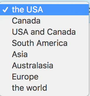 可选择地区包括:美国、加拿大、美国与加拿大、北美、亚洲、澳洲地区、欧洲地区、全球。