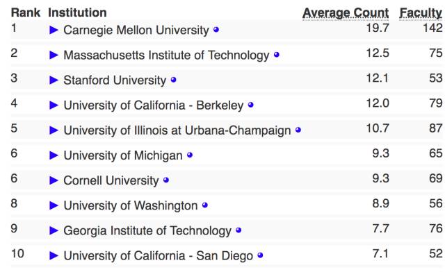 CMU、康奈尔大学、斯坦福大学分列前三。