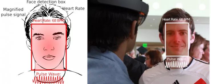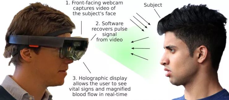 通过在人脸皮肤上覆盖了一个半透明面罩,这样就可以改变脸部皮肤的亮度,在上面显示血流信号。HoloLens开发了一种全息覆盖图,该图使用线性图像处理管线显示叠加到人脸上的脉冲信号。