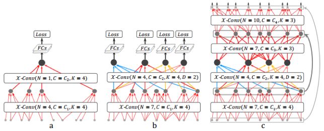 图 4:用于分类(a 和 b)和分割(c)的 PointCNN 架构,其中 N 和 C 分别表示输出代表点的数量和特征维度,K 是每个代表点的近邻点的数量,D 是 X-Conv 的扩张率(dilation rate)。