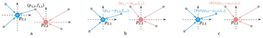 图 3:将点坐标转换为特征的过程。代表点的近邻点被变换成代表点的局部坐标系(a 和 b)。然后每个点的局部坐标都被单独提取到特征中,再与相关联的特征结合起来(c)。
