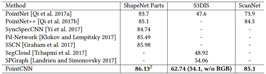 表 2:分割表现比较。在 ShapeNet Parts [Yi et al. 2016] 上比较的是部分平均 IoU(%),在 S3DIS [Armeni et al. 2016] 上比较的是均值 IoU(%),在 ScanNet [Dai et al. 2017] 上比较的是每体素的准确度(%)。