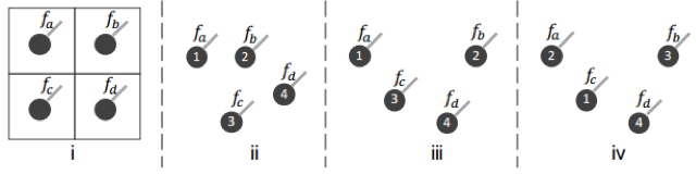 图 1:来自规则网格(i)和点云(ii、iii 和 iv)的卷积输入。在规则网格中,每个网格单元都与一个特征关联。在点云中,点是从局部近邻中采样得到的;类比于规则网格中的局部块,每个点关联了一个特征、一个顺序索引以及它的坐标。但是,缺乏规则网格使得我们难以将这些点按规范顺序排列。