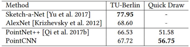 表 3:在 Tu-Berlin [Eitz et al. 2012] 和 Quick Draw [Ha and Eck 2017] 分类上的准确度(%)比较。