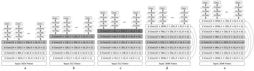 图 8:PointCNN model zoo,其中(a)用于 ModelNet40 和 ScanNet 分类,(b)用于 TU-Berlin 素描分类,(c)用于 Quick Draw 素描分类,(d)用于 ScanNet 和 S3DIS 分割,(e)用于 ShapeNet Parts 分割。