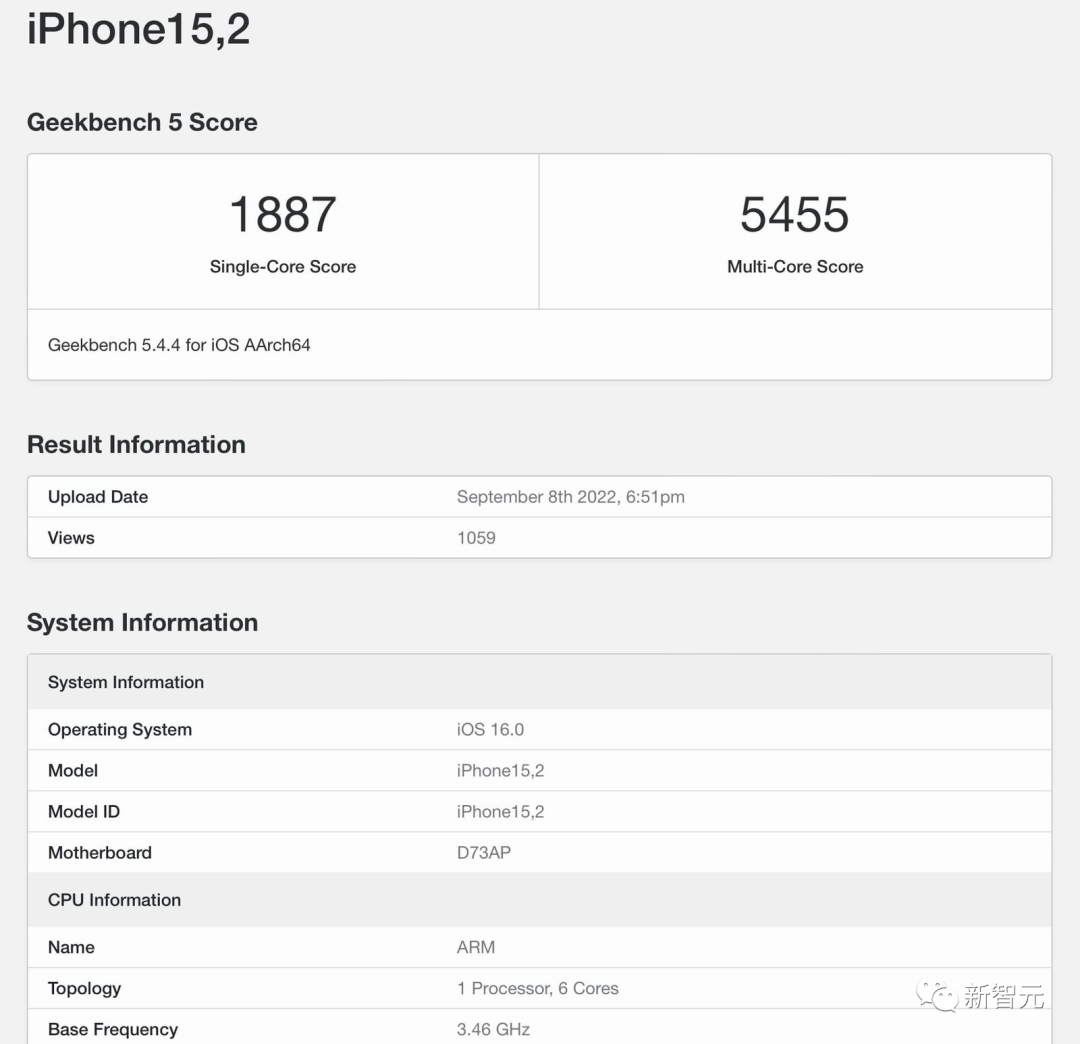 一个代号iPhone15,3,也就是iPhone 14 Pro Max的Geekbench测试结果显示,A16的单核得分为1879,多核得分为4664。