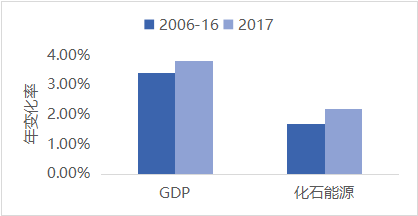 本报告主要从化石能源行业与电热能源两大方向着手,根据英国石油公司所撰写的2018年世界能源统计年鉴,化石能源消费领域在2017年底随着全球经济的变暖迎来强劲增长。根据不完全统计,2017年全球化石能源消费增幅近2.2%,远高于2016年的1.2%,更是超过过去十年能源消费平均增速1.7%。在2017年,近40%的化石能源被用于发电相关产业,并且其增长速度也接近10年来最高水平达到2.8%。但应注意到电力领域的增幅主要来自发展中国家。非化石能源的电力生产与供给正在逐渐扩大市场试图取代传统,煤,天然气等发电模式。