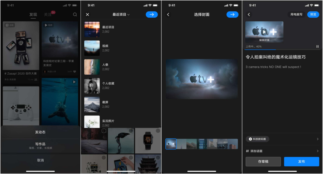 发现 Tab 瀑布流显示内容类型:动态、(长)视频、文章、海报(文章);