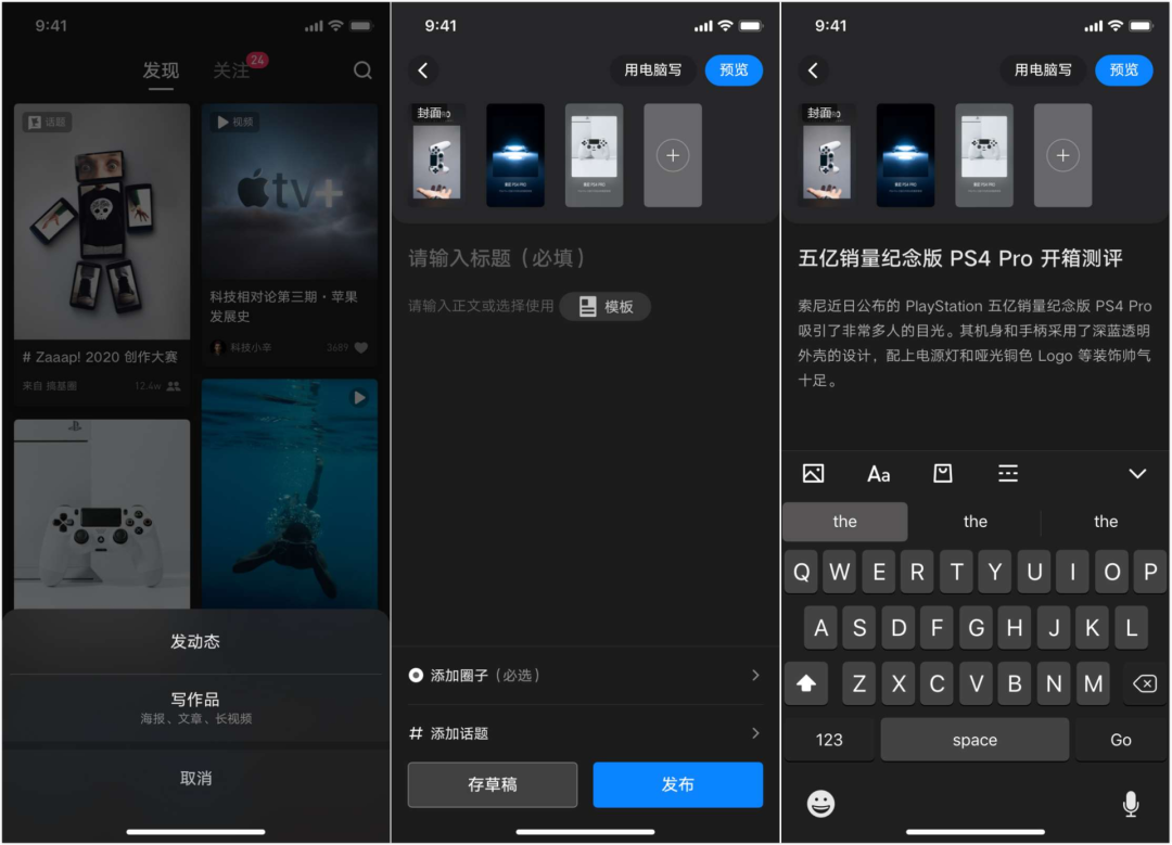 点击「+」号,选择写作品,进入作品富文本编辑器;