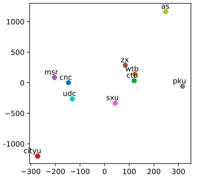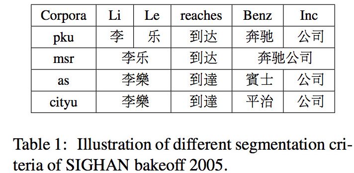 比如PKU的最大特点就是姓名拆分为“姓”+“名”,MSR的标志则是命名实体构成大量长单词,而港台地区的语言习惯本来就与大陆不同。这些差异导致无法简单合并各方语料形成一个更大量级的语料库,只能在某一个语料库上训练,浪费了其他标注数据。