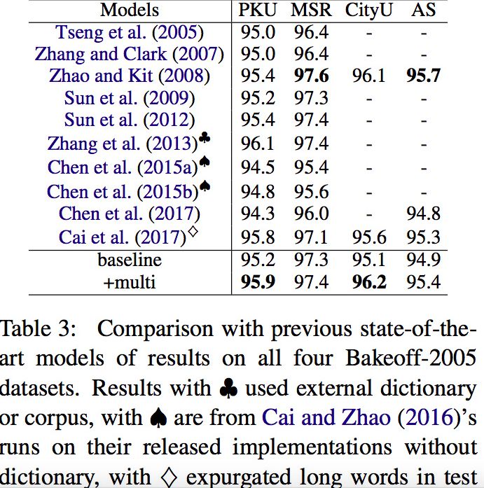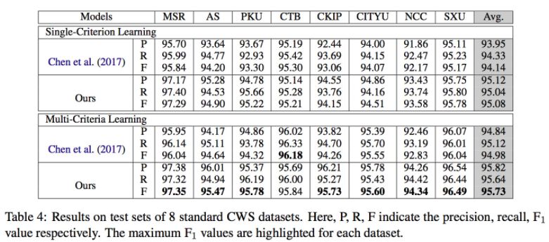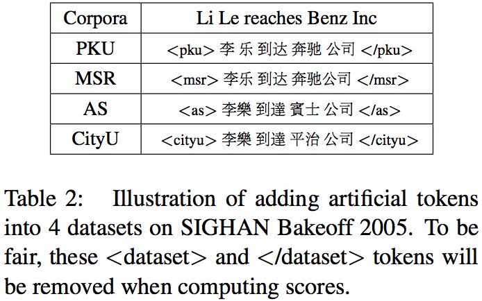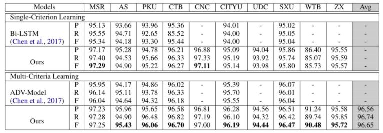 已经有工作开始研究如何利用多方语料库来联合学习中文分词,比如 Chen 20171精心设计的对抗神经网络,针对每个语料库提取分词标准相关或无关的特征。然而该工作并没有达到前沿的准确率,甚至联合训练的成绩还比不上以前单独训练的分数,无法体现联合学习的本意与优势。