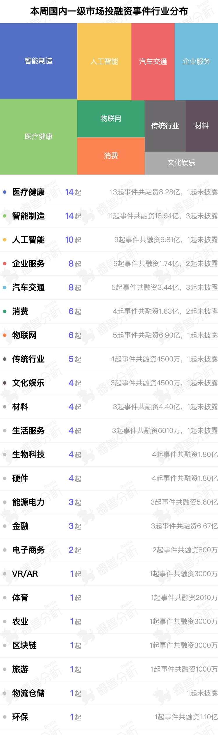 医疗健康(14个)、智能制造(14个)、人工智能(10个)领域融资最活跃。