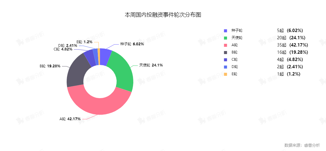根据睿兽分析监测数据,本周国内一级市场披露的融资事件83个,其中已披露融资金额的事件70个,总规模63.01亿元人民币,平均融资0.9亿元人民币。