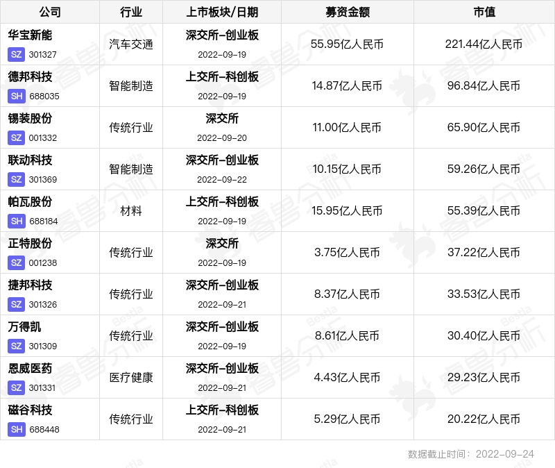本周重点监测到国内IPO公司共10家。分别于深交所主板、科创板和创业板上市,最新市值最高为