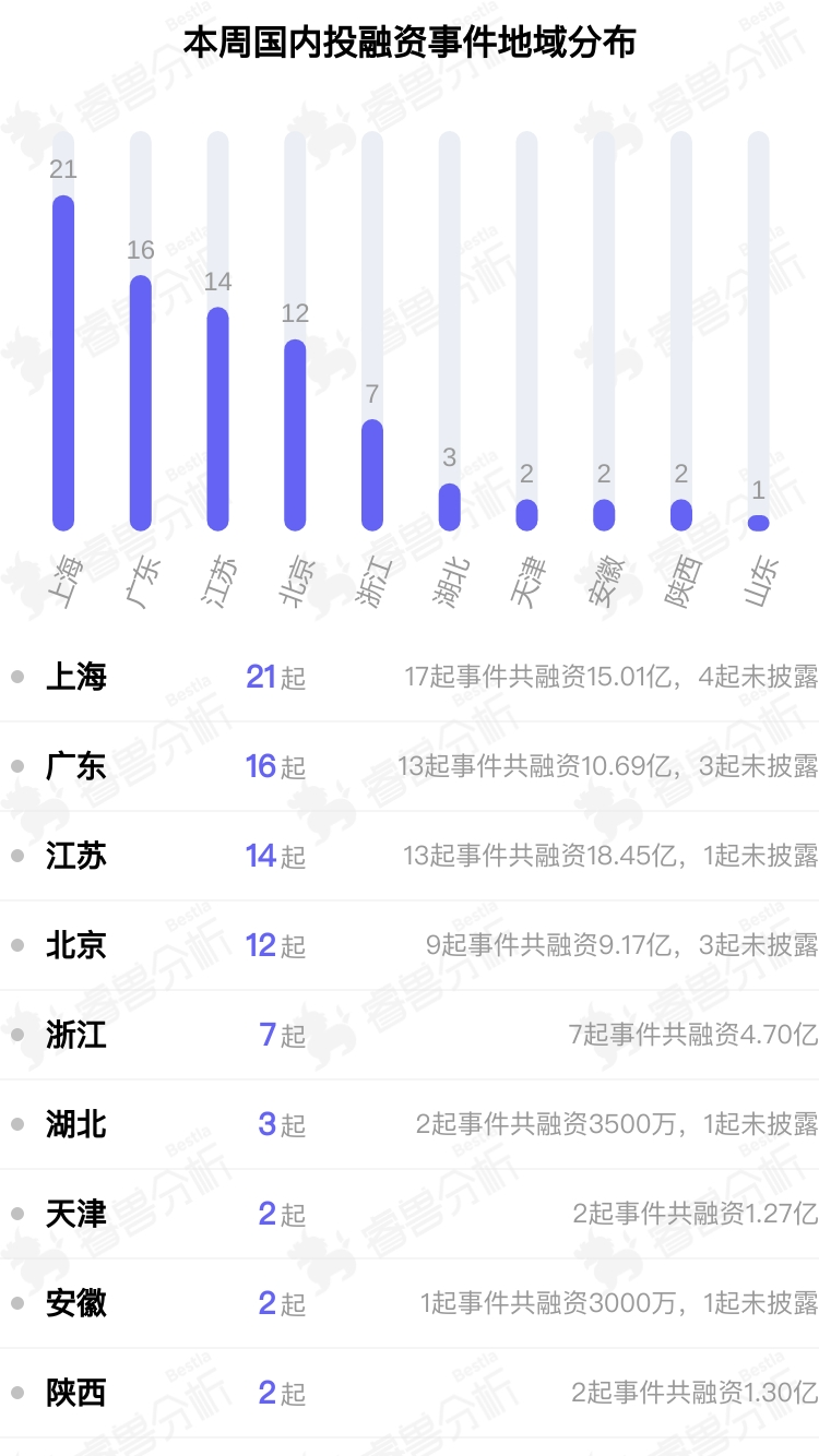 从本周披露获投企业的地域分布来看,主要集中在上海、广东、江苏。其中上海披露21个,广东披露16个,江苏披露14个。