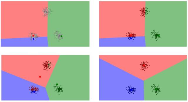 你可以像读漫画一样理解。平面上的每个数据点都根据离自己最近的重心加了颜色。你可以看到这些重心(更大一点的蓝点、红点和绿点)一开始是随机的,然后很快进行了调整,得到了它们各自的聚类。