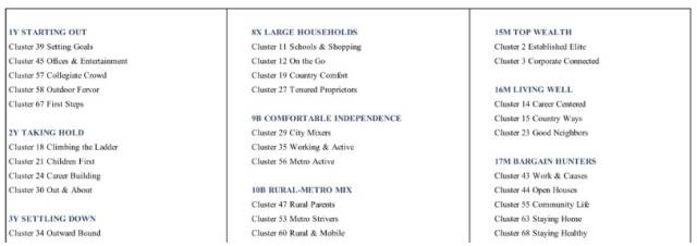 聚类的一个有趣的真实应用案例是营销数据提供商 Acxiom 的人生阶段聚类系统 Personicx。这项服务将美国家庭分成了 70 个不同的聚类,它们分属于 21 个人生阶段分组,可以被广告主用于投放定向 Facebook 广告、陈列式广告和直邮广告等。