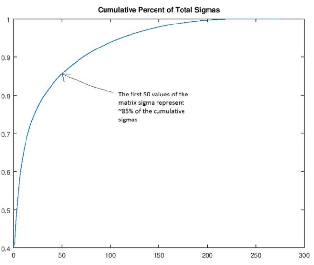 首先,我们发现如果我们根据大小排序这些奇异值(矩阵 Σ 的值),那么前 50 个奇异值将包含整个矩阵 Σ 的大小的 85%。