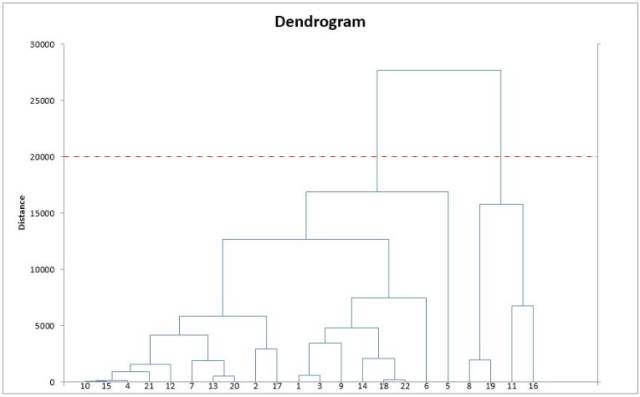 选择一个聚类数量,然后在这个树状图中划一条水平线。比如说,如果你想要 K=2 个聚类,你应该在距离大约为 20000 的位置画一条水平线,你会得到一个包含数据点 8、9、11、16 的聚类和包含其它数据点的另一个聚类。一般而言,你得到的聚类的数量就是水平线与树状图中的竖直线的交叉点的数量。