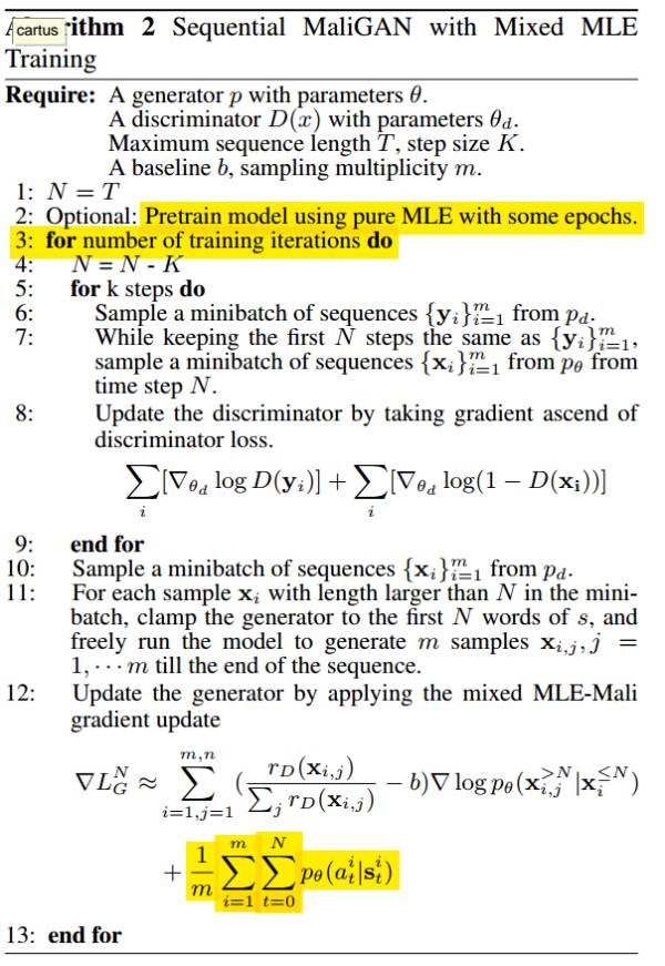 第二点是在训练G的时候同时还用了Teacher-Forcing(MLE)的方法,这点和后面的MaliGAN有异曲同工之处。