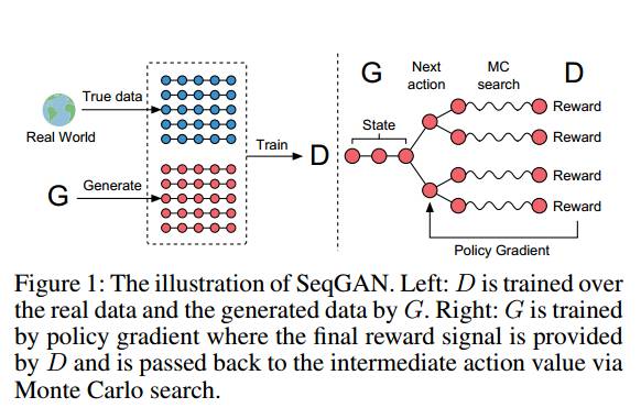 利用了强化学习的东西来解决以上问题。如图,针对第一个问题,首先是将D的输出作为Reward,然后用Policy Gradient Method来训练G。针对第二个问题,通过蒙特卡罗搜索,针对部分生成的序列,用一个Roll-Out Policy(也是一个LSTM)来Sampling完整的序列,再交给D打分,最后对得到的Reward求平均值。