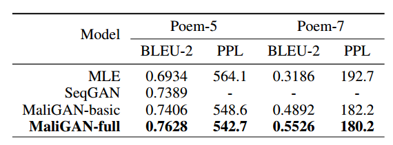 回到MaliGAN,作者给出了实验数据,比SeqGAN的效果要更好,看BLEU score.