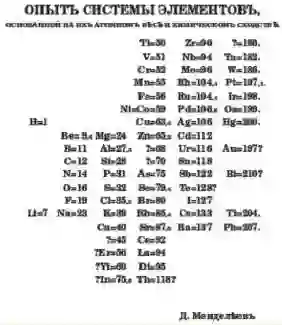 今天,包括人造元素,元素周期表共纳入118 种元素(图1)。第一个为化学家接受的元素周期表是俄国化学家门捷列夫(Дми́трий Ива́нович Менделе́ев,1834—1907)构造出来的。1869 年2 月,年轻的门捷列夫在写《化学原理》第二卷时,发现有必要对元素的性质加以梳理。在经过多次尝试以后,他获得了一个按照元素原子质量递增排列的周期表,见图2。门捷列夫元素周期表的正确之处在于,那些空白处所对应的元素,比如eka-boron(scandium),eka-aluminium(gallium),eka-manganese (technetium) 和ekasilicon(germanium),后来都被逐一发现了。