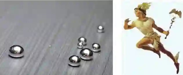 No.80 Mercury,Hg. 此元素的符号Hg 来自拉丁语hydra-gyrum,希腊语的ὑδράργυρος(hydrargyros),正对应汉语的水银(water silver),银色,室温下为液体。水银在英语中被称为quick silver, 德语称为Quecksilber,其字面意思是快银,因水银撒到固体表面上会快速溜走的缘故。这正好和名字Mercury对上,因Mercury 是罗马神话里的信使,类似送快递的(图6)。水银,俗称汞,此外它还有“白澒、姹女、神胶、元水、铅精、流珠、元珠、灵液、子明”等等别称。中国人早就有汞使用的记录。