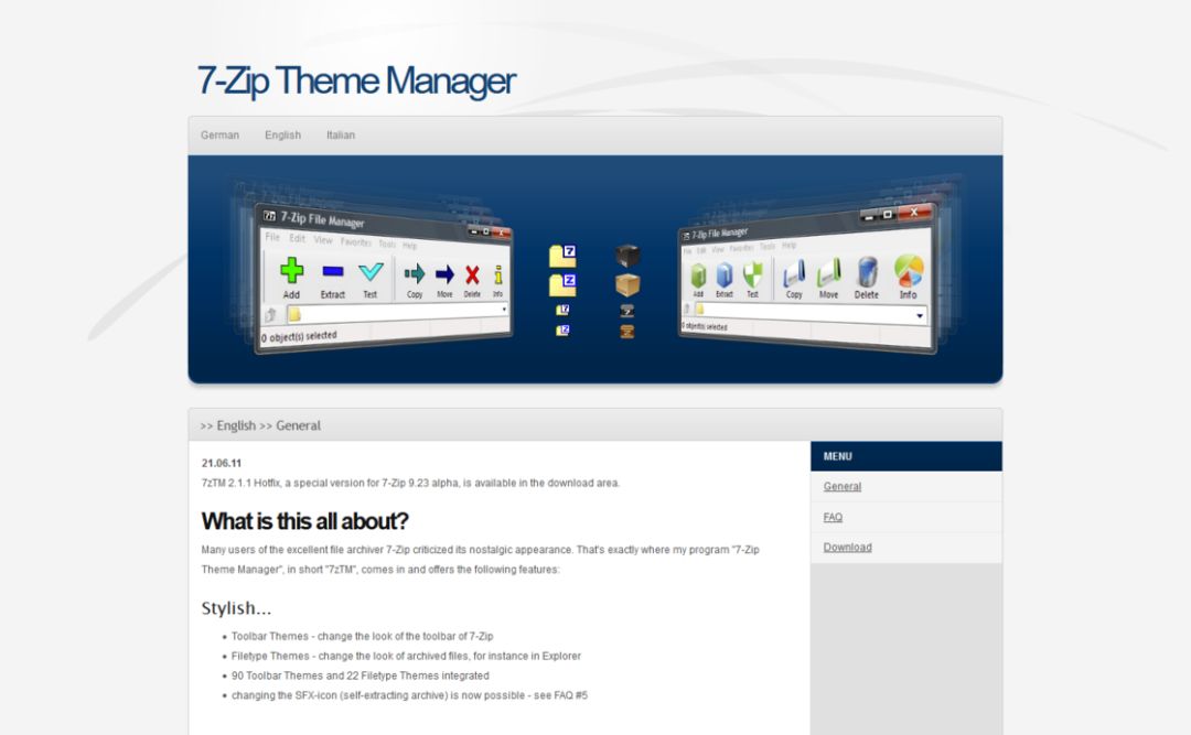 市面上存在一个古老却有效的 7-Zip 主题自定义工具:7-Zip Theme Manager,我们直接进入其官方下载页面下载最新(2011 年)的工具可执行文件:2.1.1 版本。下载解压之后,我们会直接得到一个 EXE 文件 7zTM.exe,这一可执行文件就是我们的 7-Zip 主题自定义工具,无需安装可直接使用。