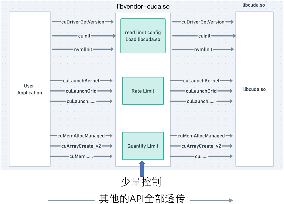 开源方案采用的是CUDA调用拦截。通常情况下,用户的AI应用程序会调用CUDA API,进而调用GPU硬件进行并行计算。libcuda.so 是用户态下最终会被调用的Driver API 库,它的接口公开但是实现细节闭源。开源方案实现了一个类似的动态库,例如libvendor-cuda.so ,劫持了应用程序对CUDA Driver API的调用,并且把调用转发给真实的GPU原厂的libcuda.so。在转发的过程中,绝大部分的API可以直接透传,而对少量API进行流控和修改。具体如下图所示:
