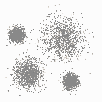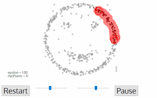 一旦我们完成了这个集群,算法又会开始检索未访问过的点,并发现更多的聚类和噪声。一旦数据检索完毕,每个点都被标记为属于一个聚类或是噪声。