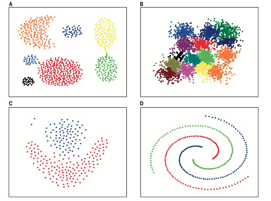 以上就是数据科学家需要知道的5个聚类方法。在文章的最后,就让我们以一幅聚类图做结,直观展示这些算法和其他算法的完美表现!