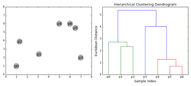首先,我们把每个数据点看作是一个聚类,即如果数据集中有X个数据点,它就有X个聚类。然后我们设置一个阈值作为衡量两个聚类间距离的指标:如果距离小于阈值,则合并;如果距离大于阈值,迭代终止。