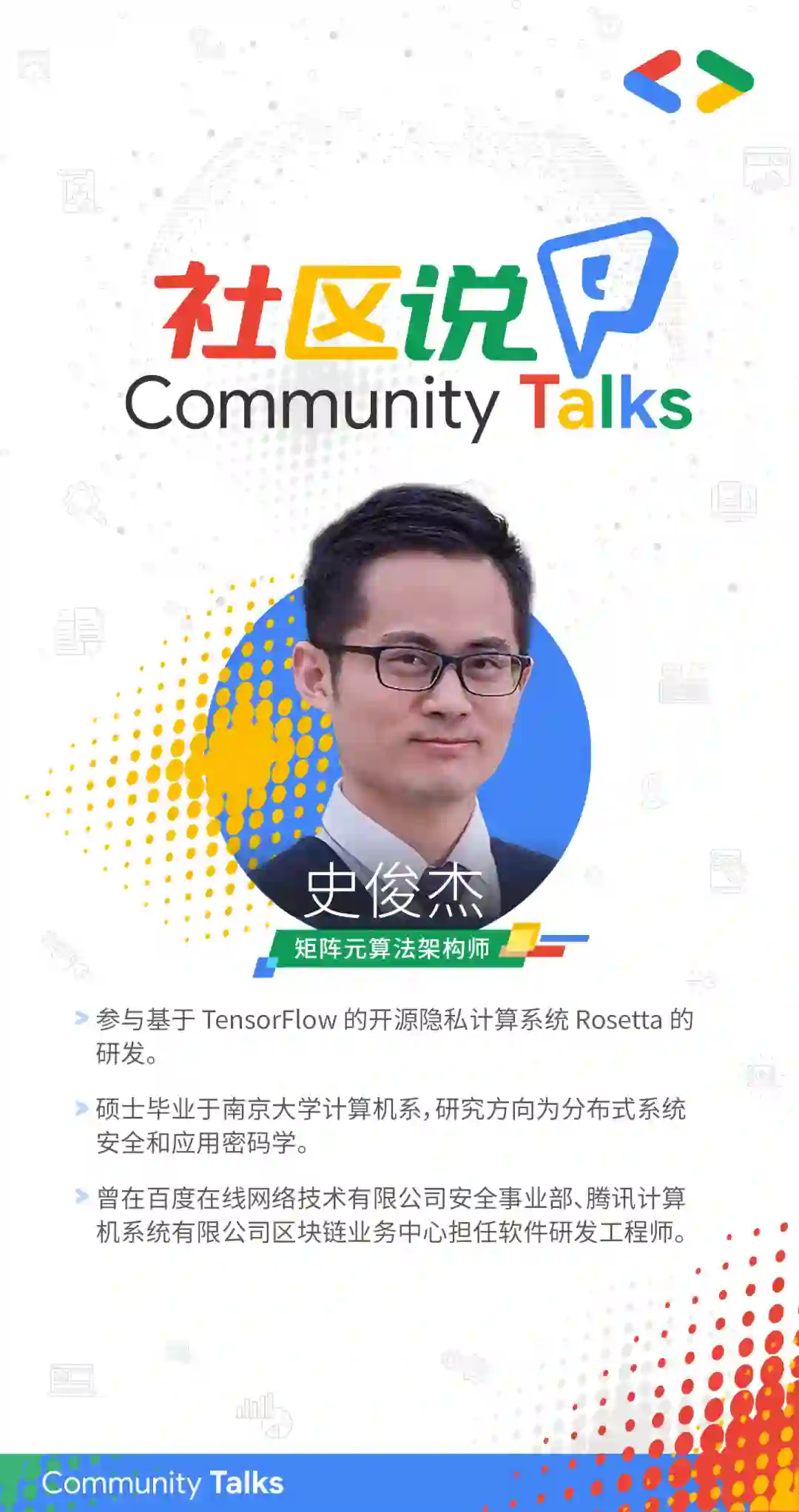 本次分享将介绍基于 TensorFlow 打造的隐私 AI 框架 Rosetta 的最新研发进展,包括如何实现在多源数据集上进行安全的大规模AI模型训练和预测、如何将密码学算法无缝快速的集成到TF框架中等。