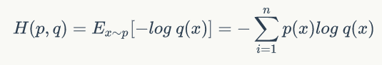 对机器学习算法比较熟悉的同学,对交叉熵应该是最熟悉的,其广泛用在逻辑回归的Sigmoid和softmax函数中作为损失函数使用。其主要用于度量两个概率分布间的差异性信息,由于其和相对熵非常相似,故详细分析对比见下一小结。p对q的交叉熵表示q分布的自信息对p分布的期望,公式定义为: