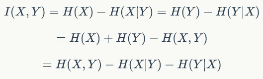具体推导由于比较简单,但是非常繁琐,此次省略。从公式中可以看出互信息是满足对称性的,其在特性选择、分布的距离评估中应用非常广泛,请务必掌握。其实互信息和相对熵也存在联系,如果说相对熵不能作为距离度量,是因为其非对称性,那么互信息的出现正好弥补了该缺陷,使得我们可以计算任意两个随机变量之间的距离,或者说两个随机变量分布之间的相关性、独立性。
