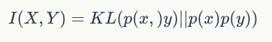 互信息在信息论和机器学习中非常重要,其可以评价两个分布之间的距离,这主要归因于其对称性,假设互信息不具备对称性,那么就不能作为距离度量,例如相对熵,由于不满足对称性,故通常说相对熵是评价分布的相似程度,而不会说距离。互信息的定义为:一个随机变量由于已知另一个随机变量而减少的不确定性,或者说从贝叶斯角度考虑,由于新的观测数据y到来而导致x分布的不确定性下降程度。公式如下: