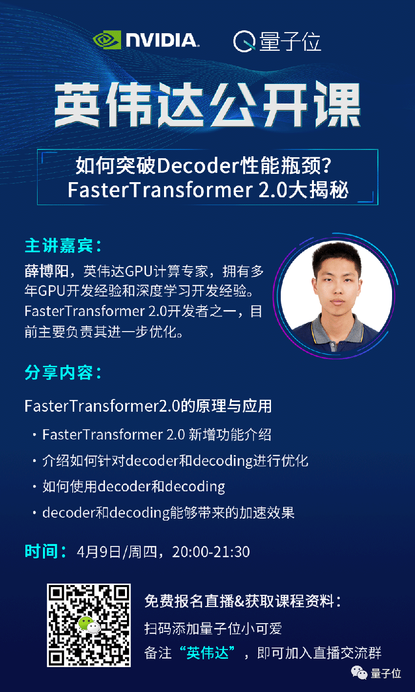 <英伟达NLP公开课>今晚8点直播,英伟达的GPU计算专家将分享 FasterTransformer 2.0 的原理与应用,分享如何针对 decoder 和 decoding 进行优化。