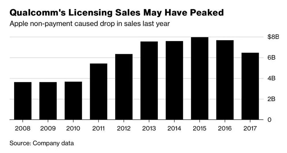 近十年高通专利授权收入变化。图片来源:彭博。