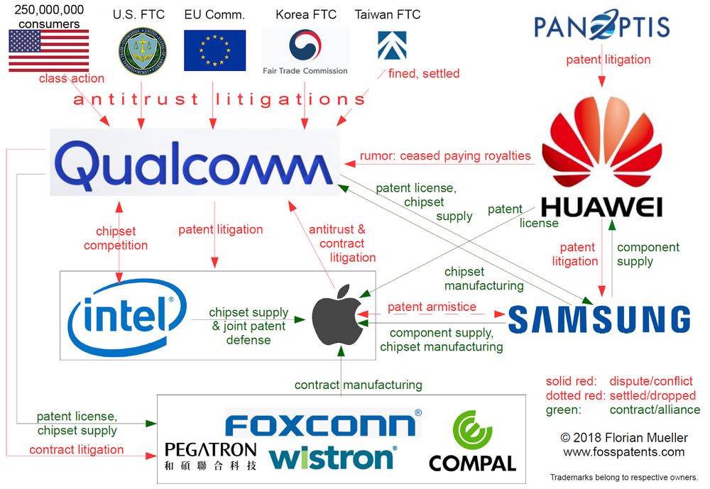 高通与全球贸易机构、以及不同公司的专利争端。图片来源:FOSS Pantents。
