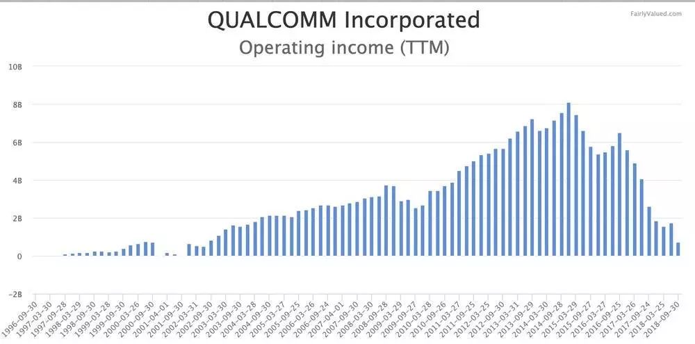 高通近 20 年的运营利润变化。图片来源:Fairy Value。