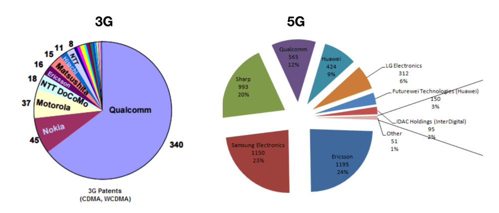 高通在 3G(左)及 5G (只计算美国)时代的专利。左图来源:MacRumor,右图来源:5G Standard Essential Patents Landscape 2018 Q2。