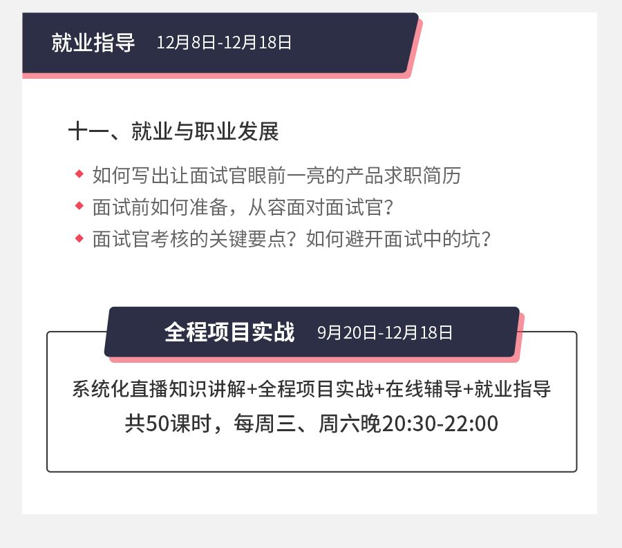 每周2次直播上课:周三、周六晚20:30-22:00,不耽误白天上班。就算错过了课程直播,你也可以在次日观看回放,回放一年内可以无限次复习观看。非常适合在职学习。