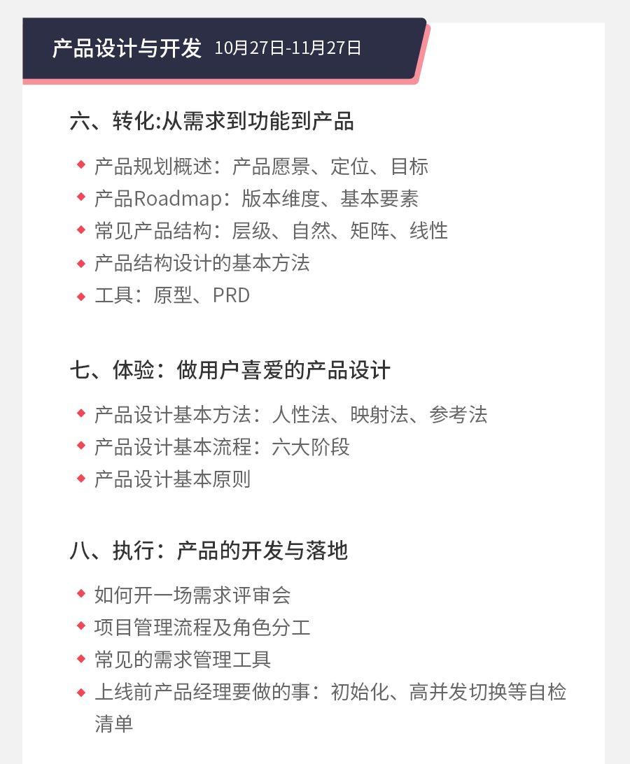 在这里,你能学习到包括市场与竞品分析、需求挖掘与管理、产品设计与开发、产品运营等在内的实用产品知识,课程系统覆盖产品知识6大板块,具体大纲如下:
