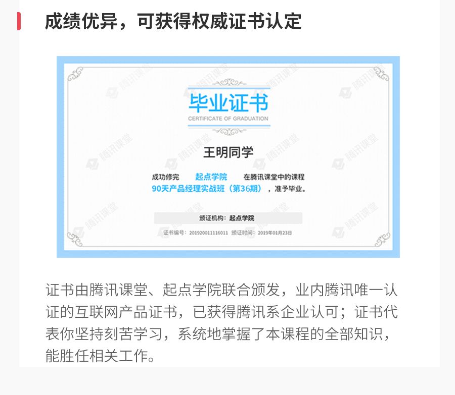 在课程结束时,成绩优异的学员,还将获得权威证书认定,这是业内腾讯唯一认证的互联网产品证书,已获得腾讯系企业认可,含金量满满!