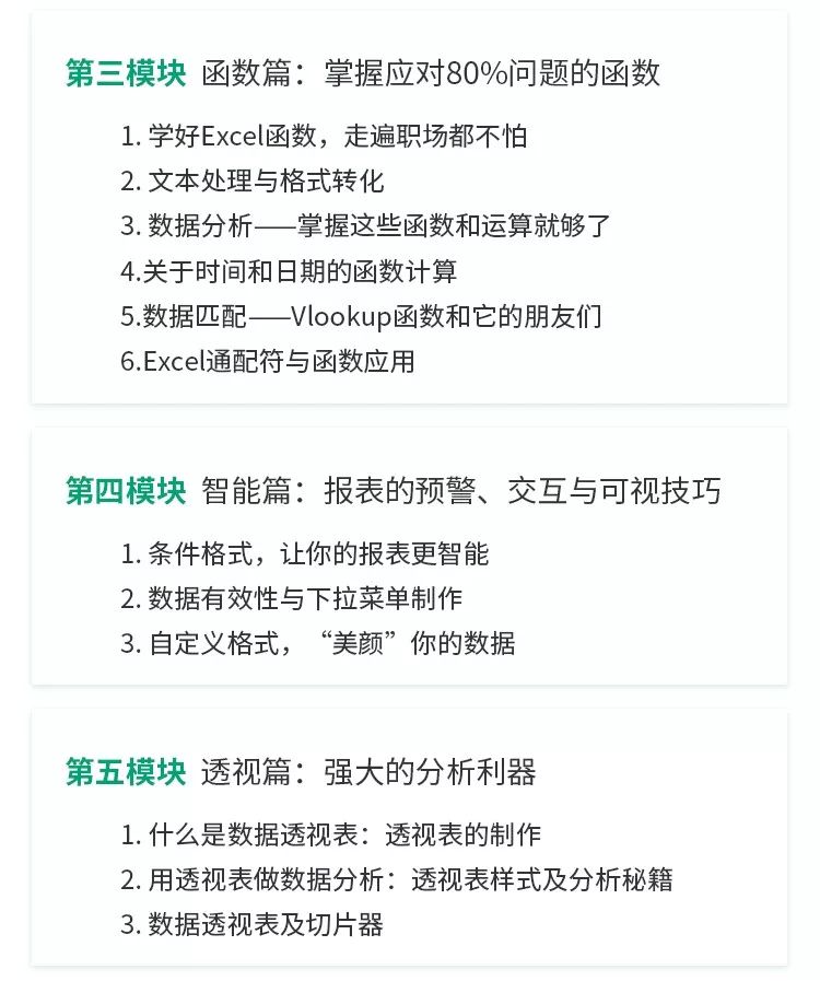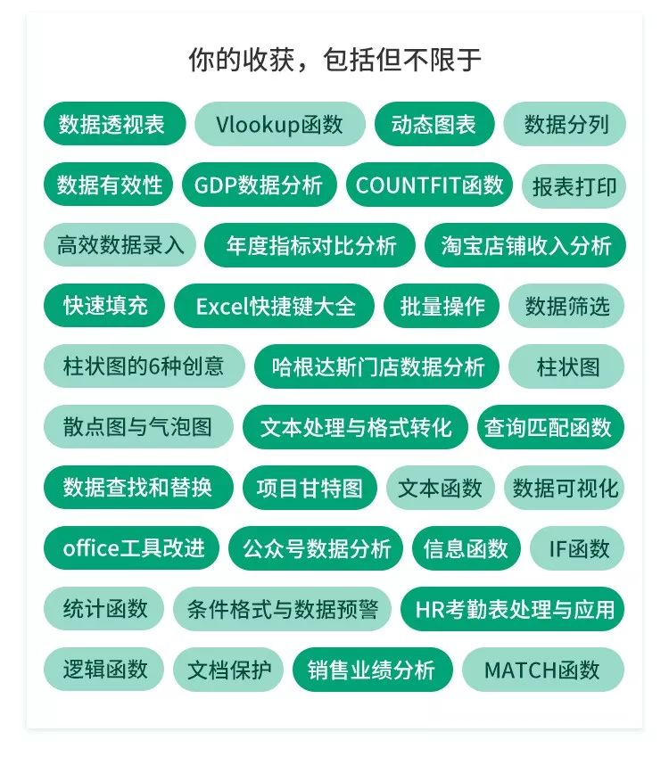 课程由浅至深,每个板块一环套着一环,从数据录入到函数,再到可视化的图表制作,帮助你系统建立Excel知识体系。