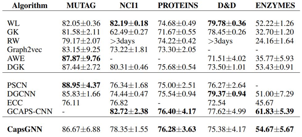 我们验证了从CapsGNN中提取的图嵌入与大量SOTA方法的性能,与一些经典方法的最优性能做了对比。此外还进行了实验研究,评估胶囊对图编码特征效率的影响。我们对生成的图/类胶囊进行了简要分析。实验结果和分析如下所示。