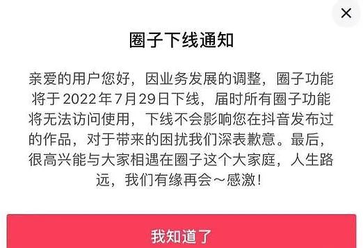 【抖音将关闭“圈子”功能】抖音将于7月29日下线“圈子”功能,届时所有同城圈子功能将无法访问使用,下线不会影响用户在抖音发布过的作品。客服表示,暂未收到有关该功能后续安排的相关信息。(北京商报)