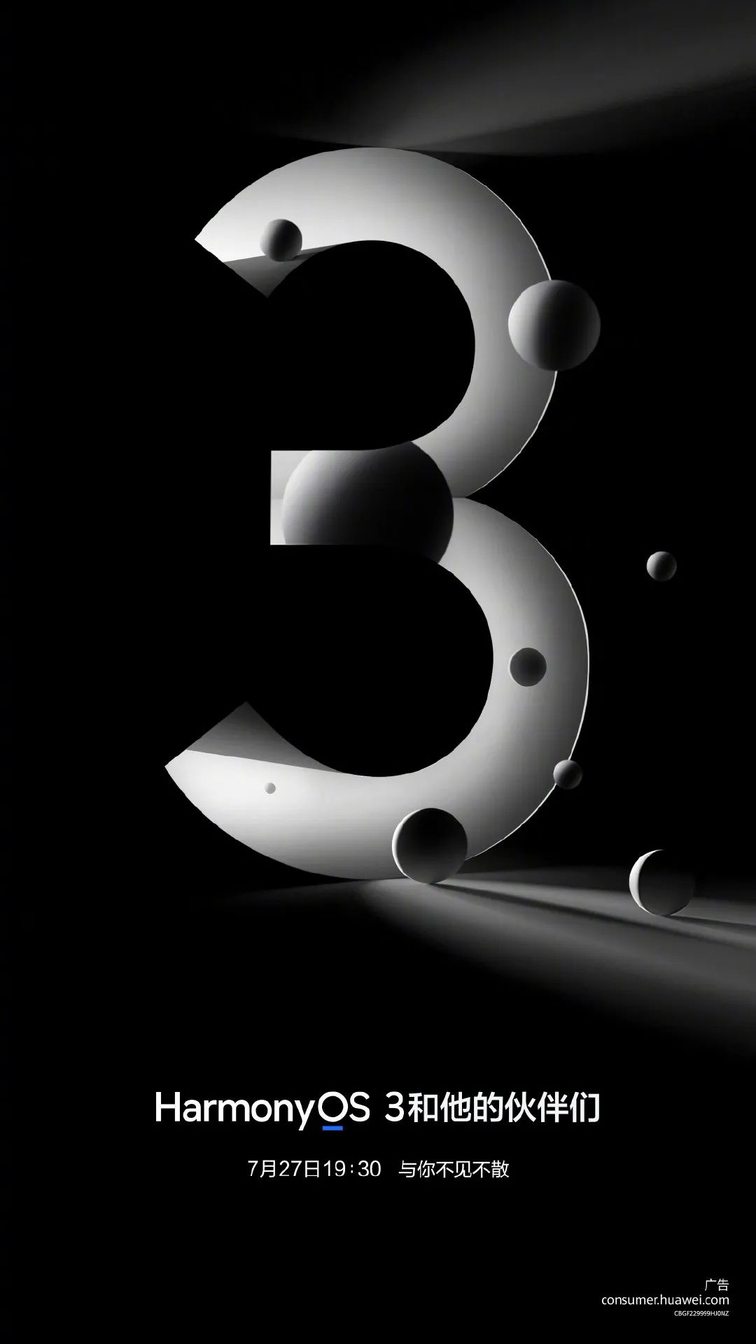 【华为HarmonyOS 3将于7月27日发布】据华为终端官方微博,HarmonyOS 3及华为全场景新品发布会将于7月27日19:30举行。